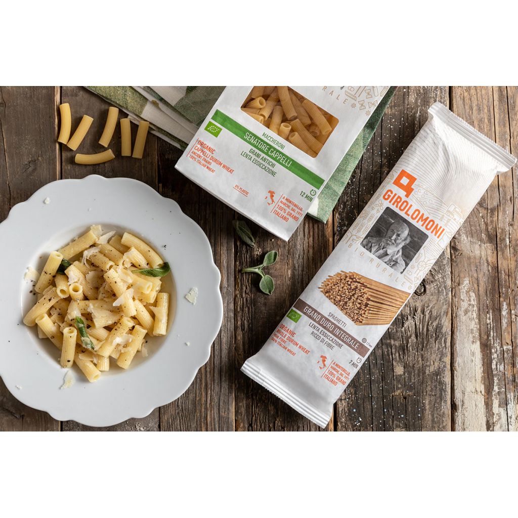 OUR PRODUCTS: Girolomoni® pasta is produced in our 100% organic pasta factory. Prime raw materials of italian origin are used in the production of our pasta, with water from a spring that does not have industrial agriculture upstream. Girolomoni® pasta is dried at a low temperature for a long time in order for the finisched product to also have all those nutritional values and organoleptic qualities found in the raw materials.