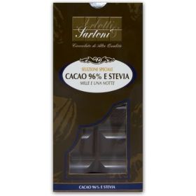 MILLE E UNA NOTTE. Questo è uno dei prodotti di punta della nostra produzione. Massa di Cacao proveniente prevalentemente dalla Repubblica Dominicana edulcorata esclusivamente con Stevia. Ormai tutti sanno che la Stevia ha un forte potere edulcorante ma con zero calorie. Il risultato è un gusto molto intenso ma gradevole concentrando in ogni assaggio i beneficio ormai acclarati del cioccolato.