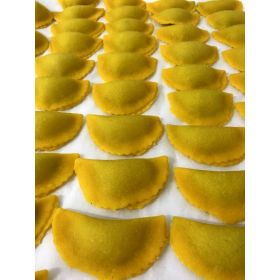 Ravioli ricotta e spinaci. Ingredienti uova fresche pastorizzate biologiche da galline allevate a terra, farina di grano tenero Molino Paolo Mariani, grani 100% italiani. Per il ripieno ricotta di pecora dell'Azienda Agricola Zerbino