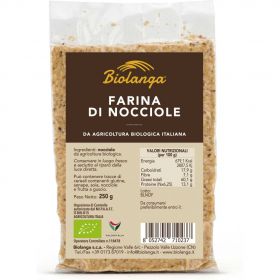 Farina di Nocciole Biologiche varietà Tonda Gentile Trilobata tostate, confezionata sottovuoto in sacchetti da 250 g.