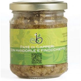 Capperi al sale marino 76%, mandorle10%, finocchietto 5%, pomodoro secco, peperoncino, aceto, olio extravergine d’oliva.