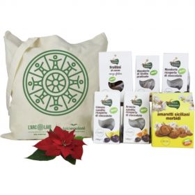 Shopper "L'ARCOLAIO" in cotone naturale Fair-Trade, contenente: Preparato per latte di mandorla, 200 gr - Cuor di limone (limone candito ricoperto di cioccolato fondente equo-solidale), 100 gr Cuore di mandorla (mandorla tostata ricoperta di cioccolato fondente equo-solidale), 100 gr Mandorle pralinate, 100 gr Frollini senza glutine e senza latte alla carruba e cannella, 230 gr - Amaretti morbidi,150 gr