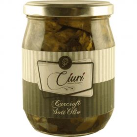 Carciofi sott’olio vengono prodotti dall'Az.Agr. Ciuri di Roberta Rabuazzo c.da Finocchiara SP208 Belpasso (CT) e trasformati e confezionati CS Agroalimentari, via G. Carducci 1, Paternò (CT).Il carciofo varietà violetto catanese viene pulito e scottato in acqua e aceto e successivamente conservato in olio di oliva Nocellara dell’etna e spezie e sottoposti a successiva pastorizzazione. Confezionamento: Vasetto di vetro da 550 g. Provenienza materie prime: tutti gli ingredienti sono di produzione propria. (Az.Ciuri) Modalità di conservazione: conservare in luogo fresco e asciutto. Una volta aperto conservare in frigorifero e consumare in tempi brevi. Modalità di utilizzo: Ottimo in aggiunta ad insalate o pasta fredda, o semplicemente come contorno o antipasto.