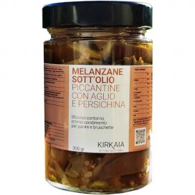 Melanzane sott'olio con aglio e peperoncino, aromatizzate con la Persichina (una particolare maggiorana dal profumo e sapore inconfondibili tipica della zona di Pergola).