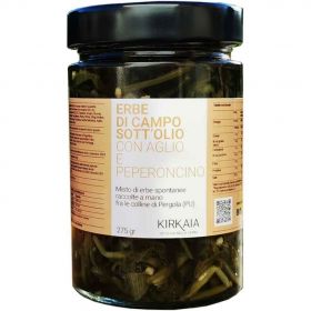 Erbe di campo miste, in proporzione variabile sott'olio con aglio e peperoncino. Raccolte e selezionate a mano. Un bouquet unico di sapori inconfondibili e proprietà benefiche. Scopri i segreti delle piante spontanee, antico rimedio alimurgico! Da assaporare, dopo aver sgocciolato l'olio, come contorno e aperitivo. Ideali come farcitura per focacce e panini o in un'insalata estiva di riso, pasta o farro.