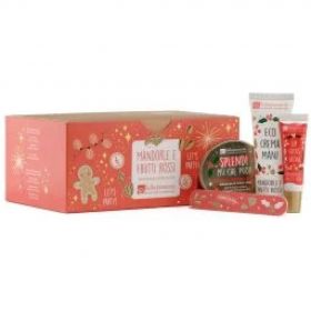 Crema Mani Mandorle e Furtti Rossi: Aqua, Punica Granatum Fruit Water*, Polyglyceryl-3 Rice Branate, Helianthus Annuus Seed Oil*, Aloe Barbadensis Leaf Juice*, Caprylic/Capric Triglyceride, Coco-Caprylate/Caprate, Propanediol, Cetearyl Alcohol, Butyrospermum Parkii Butter*, Ricinus Communis Seed Oil*, Prunus Amygdalus Dulcis Oil*, Rosa Canina Fruit Extract*, Sodium Hyaluronate, Persea Gratissima Oil, Vaccinium Myrtillus Fruit Extract*, Tocopherol, Glycerin, Parfum**, Xanthan Gum, Lactic Acid, Sodium Dehydroacetate, Sodium Phytate, Glycine Soja Oil Unsaponifiables, Helianthus Annuus Seed Oil Unsaponifiables, Benzyl Alcohol, Sodium Benzoate (*da agricoltura biologica, ** di origine naturale) Lip Gloss Glow: Ricinus Communis Seed Oil*, Oleic/Linoleic/Linolenic Polyglycerides, Helianthus Annuus Seed Oil*, Glyceryl Rosinate, Butyrospermum Parkii Butter, Caprylic/Capric Triglyceride, Mica, C10-18 Triglycerides, Hydrogenated Castor Oil, Olea Europaea Oil Unsaponifiables, Prunus Amygdalus Dulcis Oil*, Tocopherol, Vitis Vinifera Seed Oil*, Punica Granatum Seed Oil, Aroma, Beta-Caryophyllene, Vanillin, Linalyl Acetate, Terpineol, CI 77491 (*da agricoltura biologica)