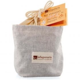 Un kit che racchiude tutto il necessario per coccolare pelle e capelli anche lontano da casa. Le travel size sono perfette per il bagaglio a mano e occupano pochissimo spazio in valigia, così hai più posto per i souvenir! La pochette è realizzata in morbido cotone e Made in Italy, ed è perfetta da portare in viaggio o tenere in bella vista a casa! Quando la apri e arrotoli i bordi, si trasforma in un delizioso cestino: così vedi a colpo d’occhio tutto quello che c’è dentro. Chiusa è pratica, aperta è geniale! Cosa c’è all’interno: • Travel-size Doccia Shampoo Family – Arancio Bio e Vitamina C • Travel-size Crema Corpo Idratante - Argan bio e Vitamina C • Travel-size Scrub Corpo Tonificante – Ginko Bio e Vitamina C • Travel-size Shampoo Rinforzante – Girasole Bio e Arancia • Travel-size Balsamo Nutriente – Girasole Bio e Avocado