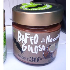 Nocciole 30%, zucchero di canna,riso in polvere 18%, olio extra vergine di oliva 15%, cacao in polvere 8%, emulsionante lecitina di girasole. Può contenere tracce di altra frutta a guscio, proteine del latte e lattosio.