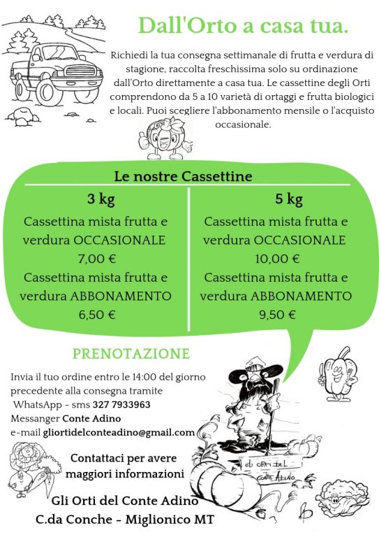 Da mio subentro, sostenuto dall'aiuto di mio padre che mi aiuta nella coltivazione, ho preferito distribuire i nostri prodotti direttamente al cliente finale eliminando totalmente il rapporto con mercati generali a cui si sono da sempre rivolti i miei predecessori. Effettuo, da quasi 10 anni, consegne a domicilio su Matera e da circa un anno, in collaborazione con un azienda del posto, anche su Taranto e provincia.