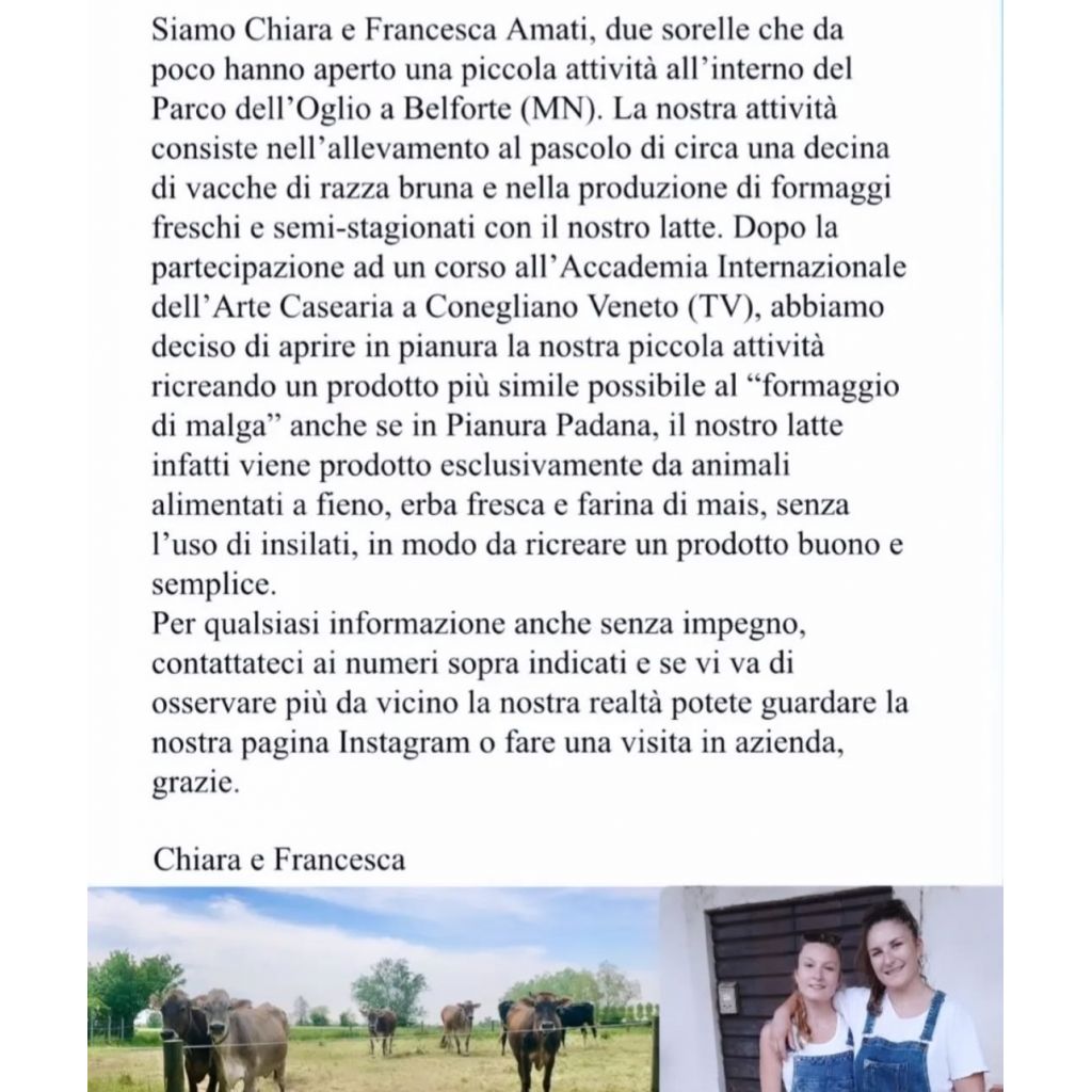 Siamo una piccola azienda agricola gestita da 2 sorelle Chiara e Francesca Amati, con un allevamento di 10 vacche di razza Bruna allevate al pascolo. Crediamo in un'agricoltura semplice, naturale e rispettosa degli animali e dell’ambiente.