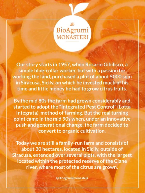 We are BioAgrumi Monasteri, an organic citrus fruits farm based in Floridia, Siracusa, Sicily. We have been growing some of the region's best quality organic Oranges (Navel, Tarocco, Valencia); Lemons (Femminello Siracusano IGP); Grapefruits (Star Ruby) and Mandarins (Tardivo di Ciaculli). Our family has been growing citrus organically for over thirty years achieving extremely high standards in quality and genuineness across all our products. We are BIOSUISSE ORGANIC certified.