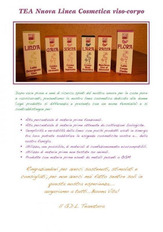 | TEA Prodotti Naturali, nasce nel 2003. Dopo altre esperienze in settori del naturale, soprattutto alimentare, mi era chiaro che nel campo della detergenza e della cosmesi c'era tanto da fare, da proporre, da ri-studiare e da ri-vedere. E così, dopo 6 mesi di studi ed esperimenti in un campo allora a me ancora "ostico",è nata TEA, con pochi soldi investiti (17.550 €) e tanti sogni... |