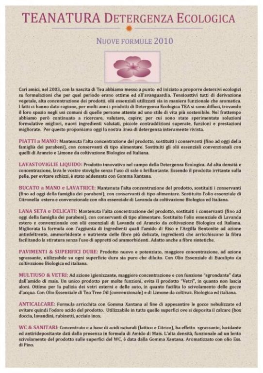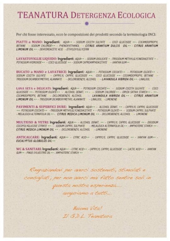In short, TEANATURA deals with: DETERGENCY Ecologica: was chosen the way of producing a full line of household cleaners obtained with the best and most natural cleansing bases available to date, tested as not irritating and obtained from raw materials only vegetable origin. For fragrances they were only used essential oils naturali.COSMESI Natural: SLS and SLES, no preservatives; washing bases and sugars derived from plant (APG) supported by plant saponins Yucca, flavored only with essential oils.