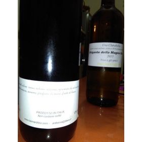 Bottiglia vino rosso rubino con bouquet di more e frutti di bosco SENZA SOLFITI secco, ma non ruvido... da pasteggiare"!