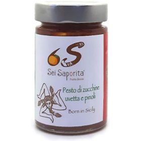 Ingredienti: Polpa di pomodoro, Zucchine Genovesi 31%, Olio extravergine d’oliva, Uvetta 2,2%, PINOLI 1%, Basilico, Sale, Zucchero, Aglio, Menta, Pepe.