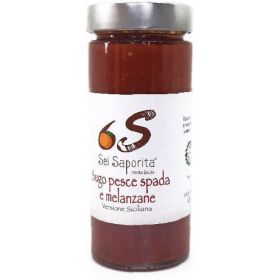 Ingredienti: Passata di pomodoro 53%, Polpa di pomodoro 15%, Melanzane 15%, pezzetti di Pesce Spada 10%, Cipolle, Olio extravergine d’oliva, Vino, Sale,pepe, Zucchero, Aglio, Basilico,Finocchietto.