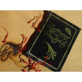 Bustina di carta confezionata a mano da 0, 1g di zafferano biologico in pistilli.