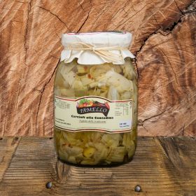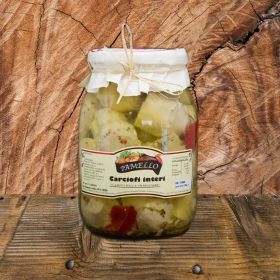 Carciofi interi, aceto, origano, aglio, peperoncino a scaglie dolce, olio di semi di girasole, correttore di acidità, acido citrico.