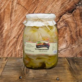 Pomodori verdi, peperoni verdi, melanzane a fetta, olive denocciolate, aglio, origano, finocchio, olio di semi di girasole.