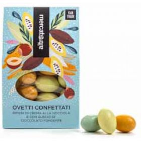 Ovetti confettati colorati, ripieni di crema alla nocciola e con gusto guscio di cioccolato fondente 170g. Fornitore Altromercato.