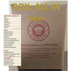 Fai scorta di tutti i prodotti Quattro stagioni per gustare a pieno tutte le bontà. il box contiene un vasetto di ognuna delle nostre specialità per un totale di 24 pezzi: 4 giardiniere (primavera, estate, autunno, inverno) 6 confetture (pesca, pera, fragola, albicocca, strudel, fichi secchi) 1 marmellata d'arancia 1 fagiolata 3 sottoli (pomodori secchi, cuori di carciofo, carciofi alloro e pepe rosa) 2 triti salati (giardiniera, rustico) 3 pesti (cavolo nero, radicchio, pomodori secchi) 1 hummus 3 creme salate (carciofi, funghi, peperoni)