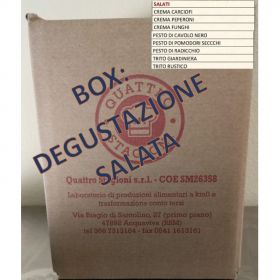 Tutte le nostre proposte salate in un'unica confezione. la confezione contiene 8 pezzi, di cui: 1 crema carciofi, 1 crema funghi, 1 crema peperoni, 1 trito rustico, 1 trito giardiniera, 1 pesto di cavolo nero, 1 pesto di pomodori secchi, 1 pesto di radicchio