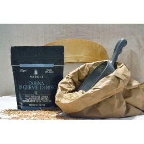 La farina di germe di riso Naroli viene prodotta dalla spremitura a freddo del germe e della pula di riso. Il “pellet” deolificato prodotto in fase di spremitura, viene successivamente macinato a pietra per ottenere la consistenza farinosa del prodotto finale. Tutte le qualità di questa farina derivano dall'attenta scelta delle fasi di produzione, dove si predilige, in primo luogo, la lavorazione esclusivamente delle parti con più nutrienti del chicco di riso mirando alla qualità piuttosto che alla quantità di prodotto e in secondo luogo, con la macinazione a pietra, non vengono alterate in alcun modo le proprietà organolettiche del prodotto. La farina ottenuta risulta così un prodotto ricco di Vitamine, sali minerali e fonte naturale di fibre. La pula, che circonda il chicco di riso, è particolarmente ricca di vitamine del gruppo B (in particolare B1, B2 e B3), vitamina D, magnesio, ferro, calcio e potassio. La presenza del germe di riso invece, garantisce a questa farina un maggior contenuto di proteine rispetto alle farine di riso presenti in commercio, poichè in queste ultime non è presente in quanto preventivamente decorticato. In sintesi, la farina di germe di riso è un alimento consigliato per tutti, ma soprattutto per i pazienti celiaci, ipertesi o con problemi cardiovascolari. Inoltre bisogna aggiungere alcune caratteristiche a quelle precedenti: una umidità molto bassa, una granulometria super-fine, un prodotto 100% naturale e naturalmente privo di glutine. I suoi forti profumi e le sue tonalità scure la rendono unica nel suo genere.