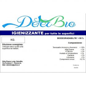 Household cleaner suitable for different types of washable surfaces. Tiles, bathroom fixtures, terracotta floors, varnished parquet, kitchen tops, stoves and doors. Bioplastic tank