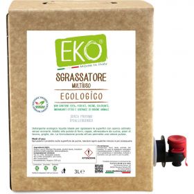 Eko sgrassatore può essere usato per la pulizia di piani cottura, piani di lavoro, forni, cappe, attrezzature da cucina, griglie cosi' come sanitari e lavabi. Può essere usato in tutta sicurezza anche su materiali in pietra naturale e resine sintetiche. Indicato anche come pretrattante per macchie grasse su indumenti o sporco grasso su stoviglie e pentolame. * prodotto certificato dall’ente BIOCERTITALIA Formato EKO BAG-IN-BOX potrai facilmente ricaricare il tuo contenitore, così riduci i consumi della plastica dell'80%