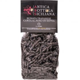 La busiata al nero di seppia è un grande classico della cucina siciliana. Ideale da condire con sughi di pesce, salsa di pomodoro e soprattutto il famoso pesto alla trapanese. Sai perché viene chiamata busiata? L'ipotesi più accreditata è che il nome provenga dalla busa, un fusto della disa - pianta tipica della macchia mediterranea - che i contadini del territorio utilizzavano per avvolgere e legare i fasci di spighe. Ingredienti: Semola di grano duro siciliano, acqua, Nero di Seppia (4%). Lavorazione: La busiata trapanese viene trafilata in bronzo ed essiccata lentamente a bassa temperatura. Tempo di cottura: 15-16 minuti