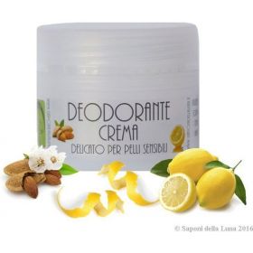 Questa crema deodorante completamente autoconservante, realizzata con ingredienti semplici e naturali unisce all’efficacia nel contrastare il proliferare dei cattivi odori causati dalla sudorazione, un’azione emolliente ed idratante anche sulle pelli più sensibili e dopo la depilazione ascellare. Proprietà e benefici della Crema Deodorante Contiene olio di Mandorle dolci, conosciuto per le sue proprietà emollienti e lenitive, burro di Karitè biologico, ricchissimo di vitamine e amido di Mais biologico utili per prevenire e curare irritazione e arrossamenti della pelle. L'azione deodorante ed antibatterica è ottenuta dalla sinergia del Bicarbonato di Sodio e Allume di Potassio che hanno proprietà deodoranti ed antisettiche, il primo contrasta l’eccessiva sudorazione in modo naturale e ristabilisce un corretto PH della pelle, il secondo, crea un ambiente inospitale per i batteri che possono insediarsi nelle zone umide del nostro corpo senza bloccare la naturale sudorazione. La presenza infine di O.E di limone, menta e tea tree, rafforzano l’azione antibatterica e conferiscono un gradevole profumo naturale a questa crema deodorante.