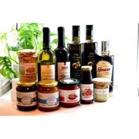 2 bottiglie olio 750cc,1 bottiglia di succo di melograno,1 bottiglia di amaro,1 bottiglia di barbera,1 bottiglia di falanghina,1 barattolo di miele di castagno,1 barattolo di miele di millefiori,1 barattolo di patè di carciofi,1 barattolo di pomodori pelati,1 barattolo di fagioli precotti