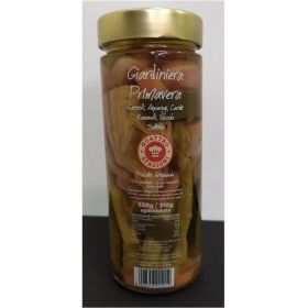 Ortaggi in proporzione variabile (carciofi, asparagi, carote, taccole, ravanelli), olio di semi di girasole, aceto di vino, sale.