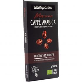 Pregiato cioccolato fondente extra con granella di chicchi di caffè arabica tostati e con zucchero integrale di canna Mascobado. Da agricoltura biologica.