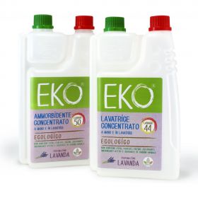 Confezione promozionale di detersivi ecologici per lavatrice e bucato a mano, sviluppati con tensioattivi ricavati da materie prime vegetali. Le profumazioni sono naturali e ipoallergeniche. Profumazione LAVANDA.