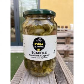 Scarole, olio di semi di girasole, aceto di vino, olive, capperi, aglio, peperoncino, sale.