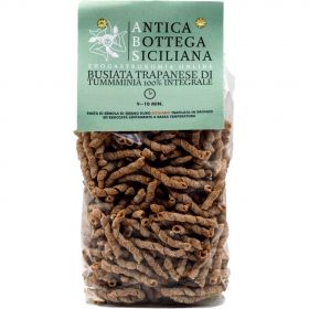La Busiata di Tumminia è una pasta artigianale prodotta con grano duro di timilia, chiamato anche grano marzuolo. La Tumminia è una coltivazione del grano marzuolo, molto usato già nell’epoca greca. Le farine ottenute da questo grano permettono la produzione di pasta dura di colore scuro che offre grande gusto e digeribilità. Sai perché viene chiamata busiata? L'ipotesi più accreditata è che il nome provenga dalla busa, un fusto della disa - pianta tipica della macchia mediterranea - che i contadini del territorio utilizzavano per avvolgere e legare i fasci di spighe. Ingredienti: farina di Tumminia, acqua. Lavorazione: La busiata trapanese viene trafilata in bronzo ed essiccata lentamente a bassa temperatura. Tempo di cottura: 8 - 10 minuti