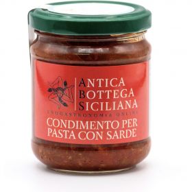 La pasta con le sarde è uno dei primi piatti siciliani più conosciuti al mondo, con questo condimento sarà velocissimo preparare la pasta con le sarde. Ingredienti: Polpa di pomodoro, salsa pomodoro, sarde, finocchietto selvatico, cipolla, olio extra-vergine di oliva, olio di girasole, uva passa, pinoli, aglio, zucchero, sale, peperoncino. Lavorazione: In una prima fase vengono pulite le sarde, successivamente queste vengono soffritte con cipolle e aglio. Infine vengono cotti con salsa di pomodoro e il resto degli ingredienti. Peso netto: 180 grammi