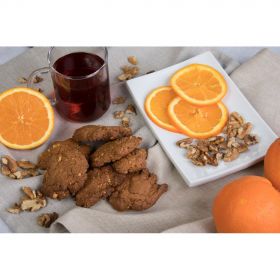 Farina di farro integrale, Zucchero integrale di canna Mascobado,Olio extravergine di oliva, Scorza d'arancia, Uova, Lievito (amido di mais, tartrato di potassio estratto dalle uve, bicarbonato di sodio), Sale marino integrale, Noci