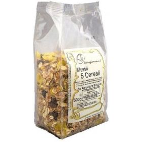 Miscela di: *Fiocchi 5 cereali 60%(*avena, *orzo,*riso, *segale, *frumento in parti uguali), *uva sultanina 25%,*corn-flakes 7%(*farina di mais 95%,*sciroppo di mais 4%,sale),*cocco grattugiato 3%,*mandorle pelate 2%, *riso soffiato integrale 2%,*semi di girasole 1%