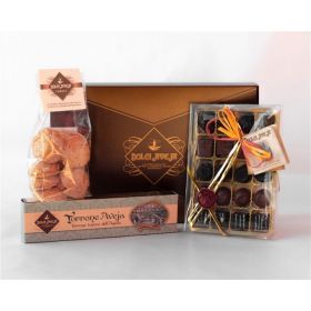 Contenuto del Pacco Maestoso: Amaretti 350g, Torroncini al Miele 350g, Cioccolatini Misti Ripieni 120g, Torrone Classico Aquilano 200g, Torrone alla Gianduia e Nocciole 200g, Ferratelline di Cioccolato Fondente 100g, Miele Millefiori 250g, Zafferano 0.3g, Nocci Interrati (Mandorle Pralinate) 350g, Tozzetti Cantucci al Cioccolato 350g: Dolci Aveja
