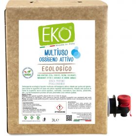 EKO detergente multiuso all’ossigeno attivo è adatto alla pulizia di tutte le superfici dure come sanitari, rubinetti, cromature, box doccia, piastrelle, etc. Adatto anche come smacchiatore e igienizzante per la biancheria. La presenza dell’ossigeno attivo assicura un’elevata efficacia del prodotto ed una significativa riduzione dell’impatto ambientale. L'igienizzazione infatti è data dal perossido di idrogeno, conosciuto già come potente virucida e battericida. Formato EKO BAG-IN-BOX potrai facilmente ricaricare il tuo contenitore, così riduci i consumi della plastica dell'80% * prodotto certificato dall’ente BIOCERTITALIA
