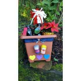Vaso per fiori in plastica con un liquore di Nonna Bea (25cl) o una grappa aromatizzata di Nonna Bea (33cl) e una bottiglia di vino (1 litro) di Nonna Bea.