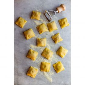 Ravioli ricotta e spinaci.Ingredienti uova fresche pastorizzate biologiche da galline allevate a terra, farina di grano tenero Molino Paolo Mariani, grani 100% italiani. Per il ripieno ricotta di pecora dell'Azienda Agricola Zerbino
