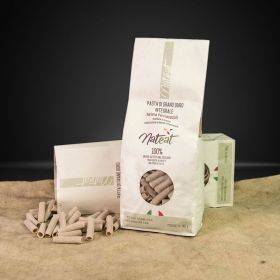 Pasta di semola di grano duro integrale macinata a pietra, trafilata a bronzo, essicata a bassa temperatura. Genuina e buona, la pasta integrale proviene dal chicco completo del grano, ancora puro, non privato cioè dalla crusca e del germe. Questo garantisce al prodotto proprietà decisamente nutrienti. Il germe di grano e ricco di acidi grassi essenziali e antiossidanti mentre la crusca offre molti sali minerali. Tale caratteristiche influiscono positivamente sul nostro intestino e sono utilissime per la prevenzione delle malattie cardiovascolari, oltre a ostacolare colesterolo alto, stipsi, grasso e fame nervosa.