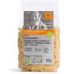 Questa pasta é prodotta utilizzando semola di grano duro: Cappelli, coltivato, con metodo biologico, dai nostri soci sulle colline marchigiane. Il Cappelli merita certamente un posto di privilegio fra le varietà di frumento duro di vecchia costituzione, perché è stata la prima varietá "eletta", selezionata da Nazareno Strampelli, il "mago del grano". Il nome ai piú non dirà niente, ma molti ricorderanno il filmato televisivo in cui Benito Mussolini lo mieteva e lo trebbiava. Era proprio il frumento duro Cappelli. Chiamato cosí, in onore del senatore abruzzese Raffaele Cappelli, promotore nei primi del '900 della riforma agraria. Il Cappelli è un grano ad alto contenuto proteico, esso si presenta maestoso ed alto nei campi. La notevole altezza di questo grano (puó raggiungere 180 cm) ha reso questa varietà difficile da coltivare perchè a rischio di continuo allettamento dovuto principalmente al vento e alle piogge. In condizioni di terreno ottimali e con un andamento climatico mite il Cappelli puó raggiungere una resa di 18÷23 q.li di produzione ad ettaro. La varietà Cappelli, la si puó definire comunque una "varietà eletta", sia perchè ha eccezionali caratteristiche proteiche ed organolettiche, sia perchè progenitrice di moltissime altre varietà coltivate ancora oggi. La pasta Girolomoni®, prodotta col 100% di semola ottenuta da questa varietà di frumento, è trafilata al bronzo ed essiccata a basse temperature in tempi molto lunghi (circa 12 ore per la pasta lunga e circa 8 ore per la pasta corta) al fine di mantenere tutti i principi nutritivi ed organolettici della materia prima anche nel prodotto finito.