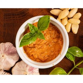 Tomatoes, dried tomatoes, sicilian almonds, basil, red garlic, extra virgin olive oil, salt, vinegar, chili pepper, sugar, sunflower oil, onion (May contain traces of other nuts)
