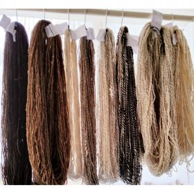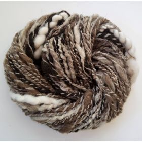 Lana di pecora nana d'ouessant, tosata, lavata, cardata, filata e ritorta interamente a mano, con realizzazione di inserti artistici. La lana presenta imperfezioni e residui vegetali non eliminabili se non con processo industriale. Va lavorata con ferri più grandi di almeno 1 numero e protetta dalle tarme. Questo è un campione, la lana va ordinata nella quantità necessaria al lavoro che si vuol fare e bisogna aspettare che la abbia filata ( circa 6 ore a matassa più 3 /6 ore di cardatura a mano con carde) pura lana vergine 100%.