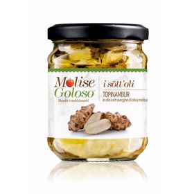 Croccanti fette di topinambur sono lavorate artigianalmente, invasettate a mano e conservate in ottimo olio extra vergine di oliva molisano. Senza conservanti.