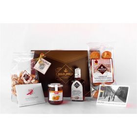 Contenuto del Pacco Fantasia: Confettura Extra di Albicocca Offidius 220g, Zafferano di Navelli in Bustina da 0.3g, Tozzetti Cantucci al Cioccolato 200g, Amaretti 200g, Liquore Amaro Abruzzese 10cl: Dolci Aveja